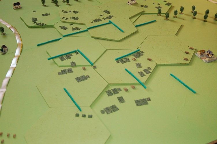 On the German side, it is unclear exactly what units were committed. According to Antony Beevor, the 17th SS Panzergrenadier Kampfgruppe (formerly Division but now much depleted) formed the troops surrounding Hill 314. For wargame purposes, it is probably well to assume that an attack on any American company would require a mixed but under-strength battlegroup of several tanks plus a company or two of armoured infantry with support from heavy weapons platoons and artillery batteries. Five ground-attack planes put in a brief appearance.