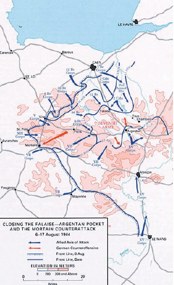 By 1000, the Germans had realised what was causing them so much grief and had launched an attack against K and E companies, preceded by an artillery bombardment and a rare appearance of 5 Luftwaffe ground attack aircraft. At 1400, the Germans attacked G company from Mortain itself. During the nights of 7/8 August and 8/9th, both sides sent out patrols, but there were no further major attacks until 2015 on 9th. The Germans overran E company positions until the commander called down heavy defensive fire on his own position, which effectively put an end to German attacks on Hill 314. The 120th remained surrounded, however, until relieved on 12th August. RAF Typhoon tank busters were called in to attack the German armoured columns, causing the destruction of surprisingly few tanks but causing many to be abandoned, to disperse or to take cover.